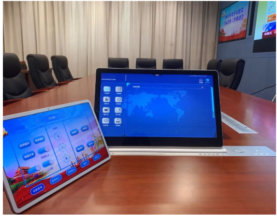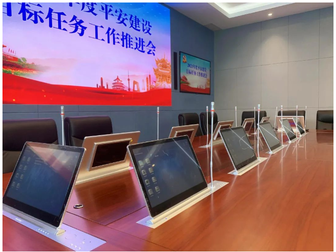 在12人的會議圓桌這里,安裝了12套WZH-L2LM 15.6"嵌入升降式無紙化終端,帶有電子桌牌和升降鵝頸發(fā)言話筒。它們具有銘牌顯示、文件批注、同屏廣播、分組廣播、異步瀏覽、跟蹤主講、外接信號顯示、臨時文件、主席控制等多種強(qiáng)大的功能;支持一鍵切換到Windows桌面,將Windows或其他軟件的操作界面同屏顯示到其它無紙化終端和大屏幕。