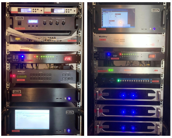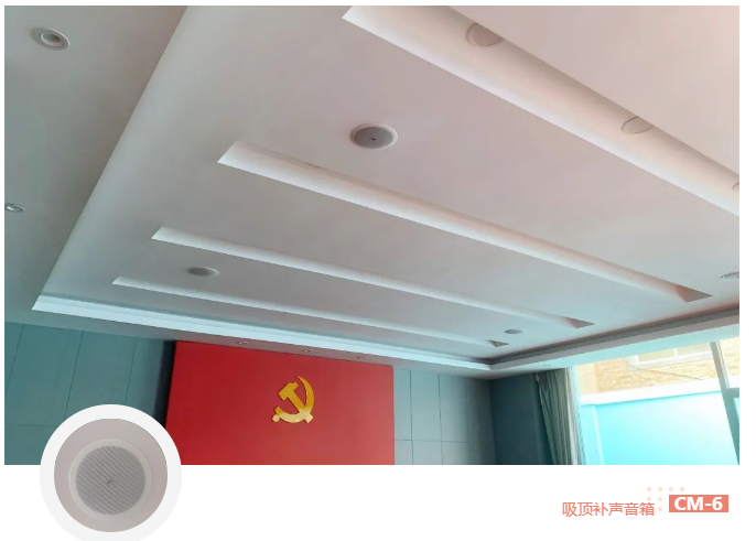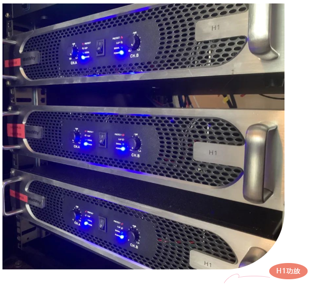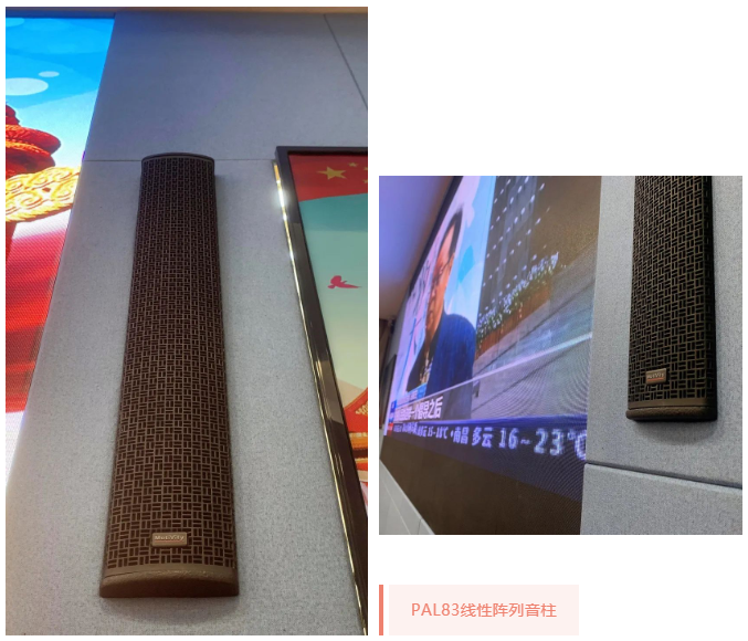 使用了兩只PAL83線性陣列音柱作為主擴(kuò)音箱,嵌入式安裝于大屏幕兩邊,天花安裝了6只CM-6吸頂補(bǔ)聲音箱(分兩只一組,共3組),搭配3臺H1功放進(jìn)行揚(yáng)聲器功率放大。整體上既保證了現(xiàn)場擴(kuò)聲均勻度,又能與環(huán)境融為一體,視覺上顯得