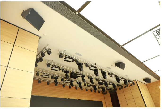 人才會(huì)堂的主擴(kuò)系統(tǒng)采用左中右聲道的系統(tǒng)設(shè)計(jì),選用EAW MKD1294,確保呈現(xiàn)出均勻的全場(chǎng)覆蓋和高品質(zhì)的語言清晰度。 系統(tǒng)還配套有EAW SB528zP超低頻揚(yáng)聲器,擴(kuò)展系統(tǒng)的低頻下限,使得主擴(kuò)系統(tǒng)兼具還音和小型演出的功能。中場(chǎng)天花處還吊掛有EAW MKD896全頻揚(yáng)聲器,做為主擴(kuò)的接力補(bǔ)聲系統(tǒng),并且臺(tái)唇處還安裝有EAW CMI5作為前置補(bǔ)聲系統(tǒng),用以覆蓋前區(qū)觀眾席,保證場(chǎng)內(nèi)的聲場(chǎng)均勻度。另外,場(chǎng)地內(nèi)還配備了EAW VFR129i和EAW VFM129i作為固定和流動(dòng)返送揚(yáng)聲器。驅(qū)動(dòng)所有揚(yáng)聲器系統(tǒng)的是易科國(guó)際自主研發(fā)的ezacoustics QAD1000、QAD700和QAD500功放,這些功放均內(nèi)置有DSP,且配有Dante接口,系統(tǒng)信號(hào)鏈路采用Dante與模擬雙備份的的方式,保證系統(tǒng)的穩(wěn)定性和安全性。