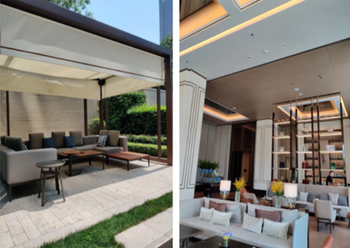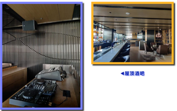 27樓屋頂酒吧Flair,分室內(nèi)室外兩部分,配置DJ打碟機(jī),主擴(kuò)聲由EV SM系列全頻同軸+15寸超低音組成,室外視野極佳,就坐于池水邊。身邊綠植叢中隱藏的EV 8寸蘑菇音箱同步播放室內(nèi)音樂,品美酒賞夜景甚為愜意,開業(yè)即成為高新區(qū)的一個新的網(wǎng)紅打卡地。