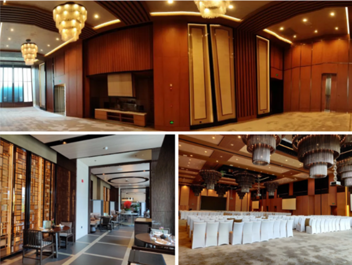 主題為“絲綢之路”的小宴會廳位于酒店一樓,可分合式的宴會廳,能夠根據(jù)使用需求任意組合布置,滿足餐飲、會議、宴會等多種場景?,F(xiàn)在的擴(kuò)聲系統(tǒng)采用EV 8寸吸頂,由AEV的DPA系列內(nèi)置DSP數(shù)字功放以定阻模式驅(qū)動。投影采用EPSON高清激光投影機(jī),根據(jù)安裝位置更換的不同的鏡頭,達(dá)到投影的最佳效果。