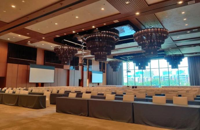 酒店的大宴會廳位于酒店二樓,場地面積1100平米,層高8米。現(xiàn)場擴(kuò)聲采用了EV的12寸吸頂音箱,均勻的聲場分布,充足的聲壓級,讓大宴會廳舉辦的活動,無論是會議還是宴會,擴(kuò)聲都得到了保證。因?yàn)閳龅靥旎▋?nèi)設(shè)備管道眾多,施工時使用了更薄的方形箱體,在不破壞裝修的情況下,節(jié)省了空間,更加的美觀。