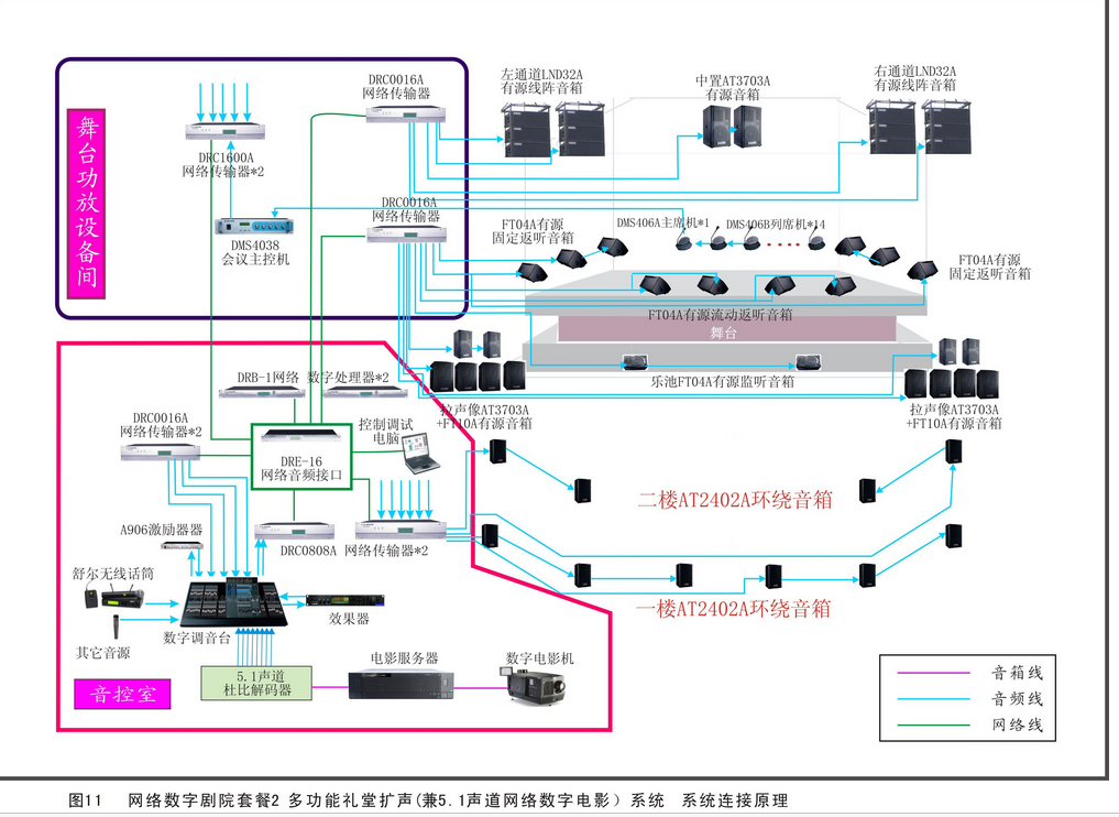 劇院的觀眾廳擴聲系統(tǒng),舞臺返送監(jiān)聽系統(tǒng),以及控制室監(jiān)聽系統(tǒng)。
