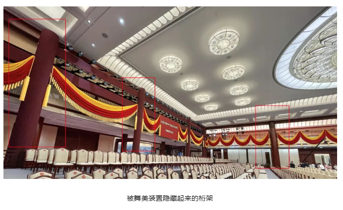 因廳內無吊點可用,上空中央有紅色五角星花燈,大廳四周用立柱分割出環(huán)廊,于是在舞臺區(qū)搭建了跨度達29 m的主結構架,用于固定舞美景片及吊掛燈具。舞臺背景使用紅色五角星的門頭造型,三重門柱依次向舞臺縱深排布,舞臺后端設置了P2高清LED屏幕。廳內兩側回廊前搭設一組細長的結構架,裝飾金色麥穗以及弧形布縵。在觀眾席的最后排位置搭建了一組高度9 m、跨度28 m的多立柱結構龍門架,同樣與舞美設計一并進行整體裝飾,把結構架隱密在現(xiàn)場環(huán)境中,使之在視覺形象上成為場地本身的一部分。