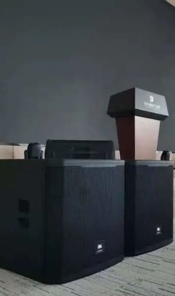 廳內主擴采用8只美國JBL Professional SRX910LA新一代巡演級線陣列揚聲器,搭配新一代智能有源超低PRX918XLFW,舞臺返送采用PRX912雙分頻揚聲器,共同打造極致的聲音體驗。PHONIC ACUMEN 6A高保真監(jiān)聽音箱提供高質量的音頻監(jiān)控。