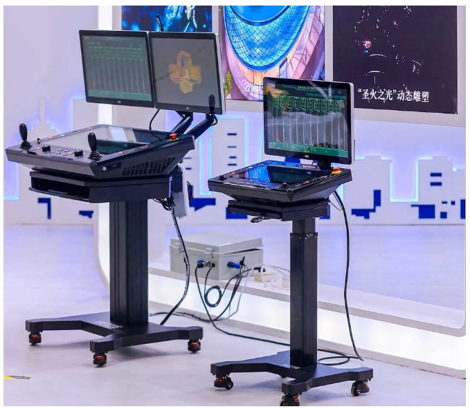 北特圣迪展出最新研發(fā)的兩款新型舞臺(tái)機(jī)械多信息集成交互控制臺(tái),該控制臺(tái)對(duì)硬軟件性能和操控性進(jìn)行了雙重提升,可實(shí)現(xiàn)高科技演藝裝備在不同應(yīng)用場(chǎng)景下的精準(zhǔn)、快速、便捷控制,分為標(biāo)準(zhǔn)型和便攜式兩個(gè)型號(hào)。新型控制臺(tái)人機(jī)交互界面更加友好,寬大的顯示屏使信息承載量大幅提升。內(nèi)置工控機(jī)裝配強(qiáng)大CPU和高配置顯卡,使得運(yùn)行更為流暢。內(nèi)置的高速通訊接口(Profinet、EtherCat等),可快速收發(fā)主PLC的控制指令,從而進(jìn)一步提升信息傳輸?shù)膶?shí)時(shí)性和可靠性。